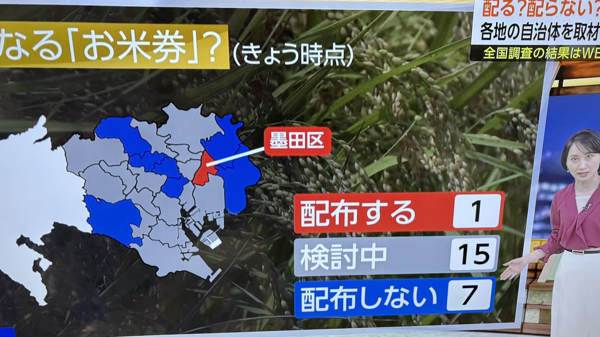 国の重点支援地方交付金事業について自治体ごとに決めることができます。お米券を配る予定は墨田区だけだと昨日NHKで報道されました。お米券のみならず その他のクーポン券(紙のもの)または電子ポイントなど、住民の皆さんが選べるようにして配るが正解です。1世帯あたり1万円、所得制限なしを予定しております。 また同時期に児童手当1人2万円追加給付も併せて可決しています。ご案内が行くまでしばしお待ち下さい。