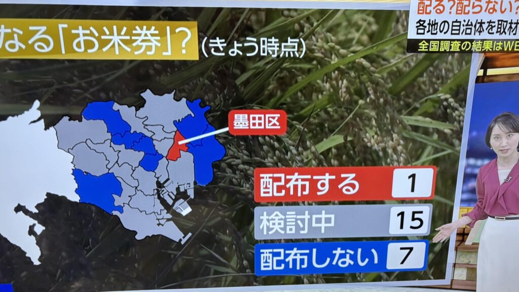 国の重点支援地方交付金事業について自治体ごとに決めることができます。お米券を配る予定は墨田区だけだと昨日NHKで報道されました。お米券のみならず